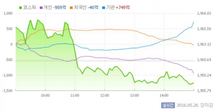 이날 코스피는 전일 대비 0.27% 상승한 1965.81에 장을 시작했다. 이후 지수는 1960대 중반에서 움직였다. 그러나 개인과 외국인의 매물에 약보합세로 돌아섰다.