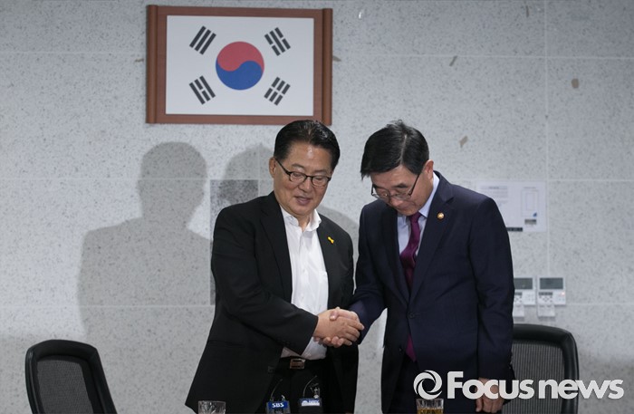 (서울=포커스뉴스) 박지원(왼쪽) 국민의당 원내대표가 26일 오후 서울 여의도 국회 의원회관에서 이기권 고용노동부 장관과 면담에 앞서 인사하고 있다.
