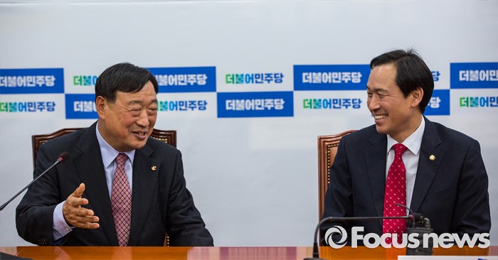 (서울=포커스뉴스) 이희범(왼쪽) 평창동계올림픽조직위원장이 26일 오후 서울 여의도 국회에서 우상호 더불어민주당 원내대표를 예방하고 있다.