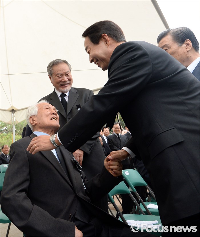 (서울=포커스뉴스) 故 김영삼 전 대통령 묘비 제막식이 열린 26일 오후 서울 동작구 국립현충원에서 최형우 전 내무부 장관이 참석해 차남 현철씨와 대화를 하고 있다.