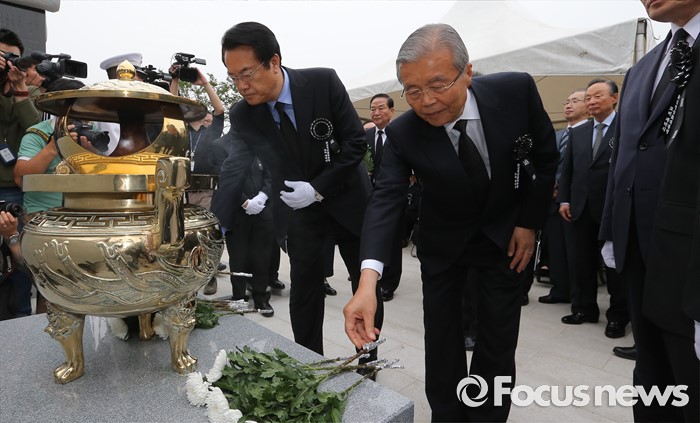 (서울=포커스뉴스)26일 오후 서울 동작구 국립현충원에서 열린 고 김영삼 전 대통령 묘비 제막식에서 정진석(왼쪽) 새누리당 원내대표와 김종인 더민주당 비대위 대표가 헌화를 하고 있다.