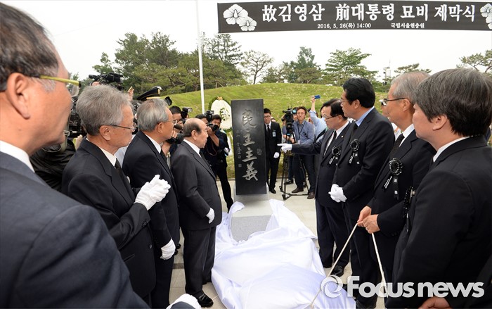 (서울=포커스뉴스) 26일 오후 서울 동작구 국립현충원에서 열린 고 김영삼 전 대통령 묘비 제막식에서 홍윤식(왼쪽부터) 행정자치부 장관, 현기완 청와대 정무수석, 박희태, 박관용, 이수성, 김수한 전 국회의장, 정의화 국회의장, 새누리당 정진석 원내대표, 더불어민주당 김종인 비상대책위원회 대표, 국민의당 안철수 공동대표가 묘비 제막식을 하고 있다.