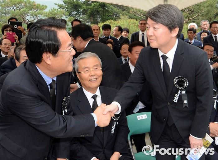 (서울=포커스뉴스) 26일 오후 서울 동작구 국립현충원에서 열린 고 김영삼 전 대통령 묘비 제막식에서 정진석(왼쪽) 새누리당 원내대표와 안철수(오른쪽) 국민의당 상임공동대표가 악수를 하고 있다. 가운데는 김종인 더불어민주당 비대위 대표.