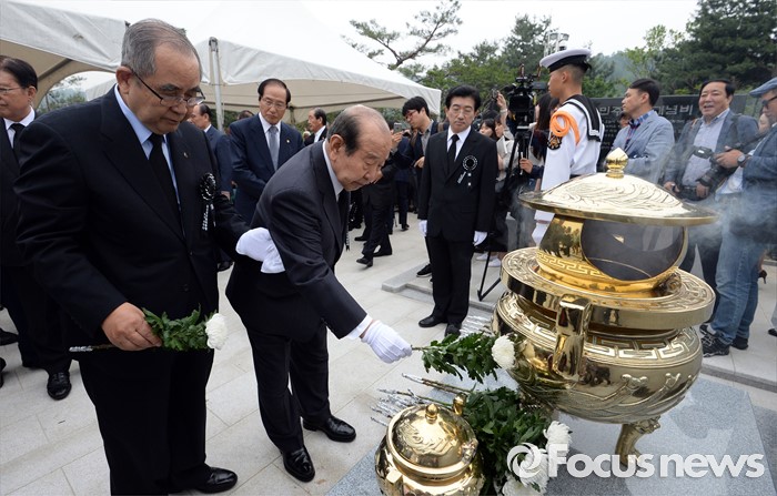 (서울=포커스뉴스) 26일 오후 서울 동작구 국립현충원에서 열린 고 김영삼 전 대통령 묘비 제막식에서 이수성(왼쪽) 전 국무총리와 김수한 전 국회의장이 헌화를 하고 있다.