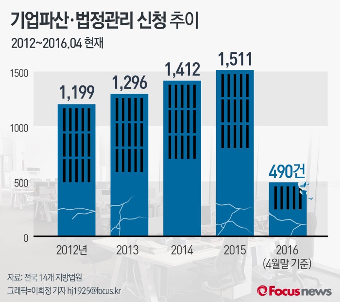 (서울=포커스뉴스) 26일 전국 14개 지방법원에 따르면 기업(법인)의 파산·법정관리 신청이 매년 증가세를 보이고 있다. 올해 4월까지 기업의 파산 및 법정관리 신청 수는 490건으로 지난해 같은 기간 480건과 비교해 10건 증가해 올해에는 사상 최대의 파산·법정관리 신청률을 보일 것으로 예상된다.