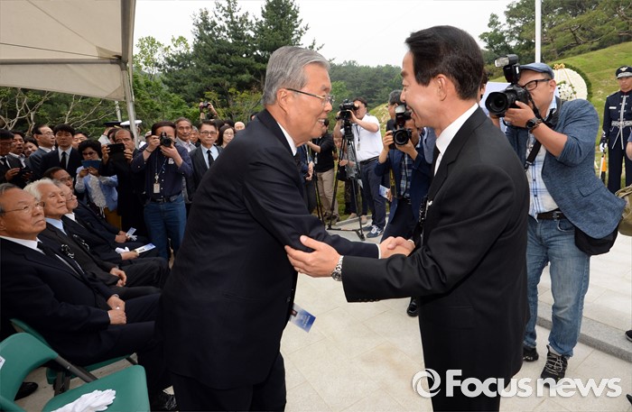 (서울=포커스뉴스) 26일 오후 서울 동작구 국립현충원에서 열린 고 김영삼 전 대통령 묘비 제막식에서 김종인(왼쪽) 더불어민주당 비대위 대표가 김 전 대통령의 차남 김현철씨와 악수를 하고 있다.