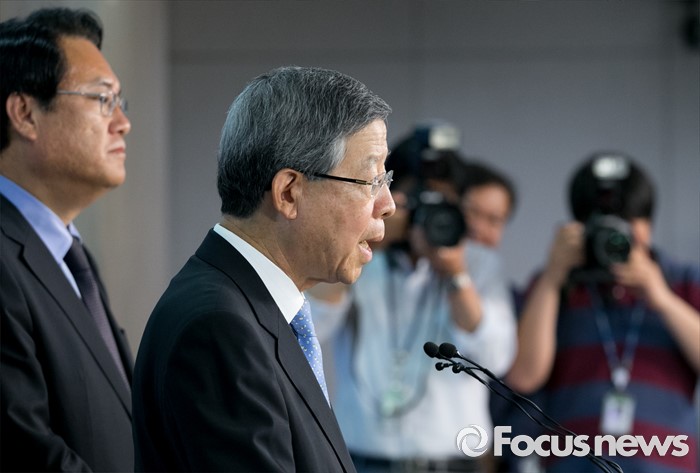 (서울=포커스뉴스) 새누리당 혁신비대위원장에 내정된 김희옥(왼쪽) 전 동국대 총장과 정진석 원내대표가 26일 오후 서울 여의도 국회 정론관에서 기자회견을 하고 있다.