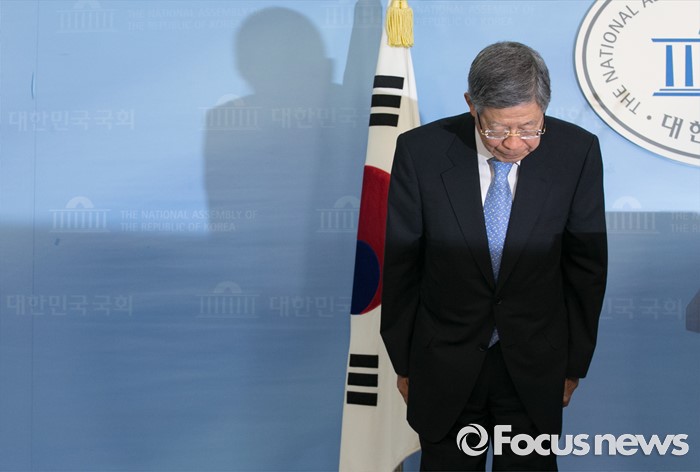 (서울=포커스뉴스) 새누리당 혁신비대위원장에 내정된 김희옥 전 동국대 총장이 26일 오후 서울 여의도 국회 정론관에서 기자회견에 앞서 인사하고 있다.