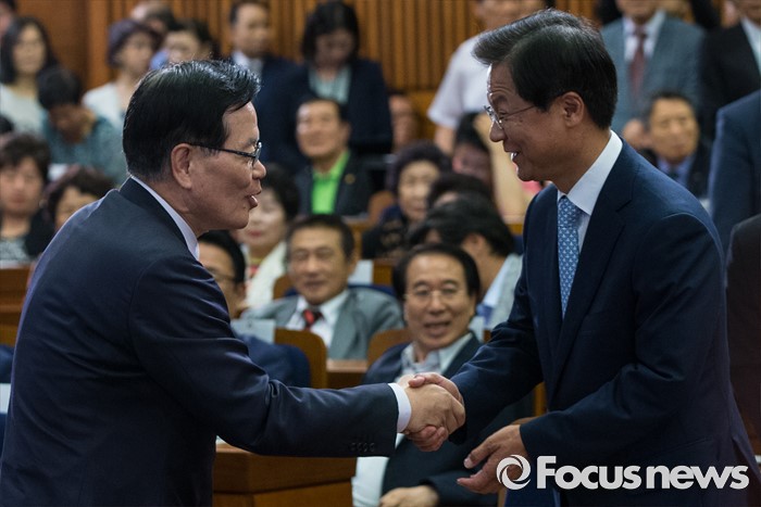 (서울=포커스뉴스) 26일 오후 서울 여의도 국회 헌정기념관에서 열린 '새한국의 비전' 창립 기념식에 참석한 정의화(왼쪽) 국회의장과 천정배 국민의당 공동대표가 악수하고 있다.