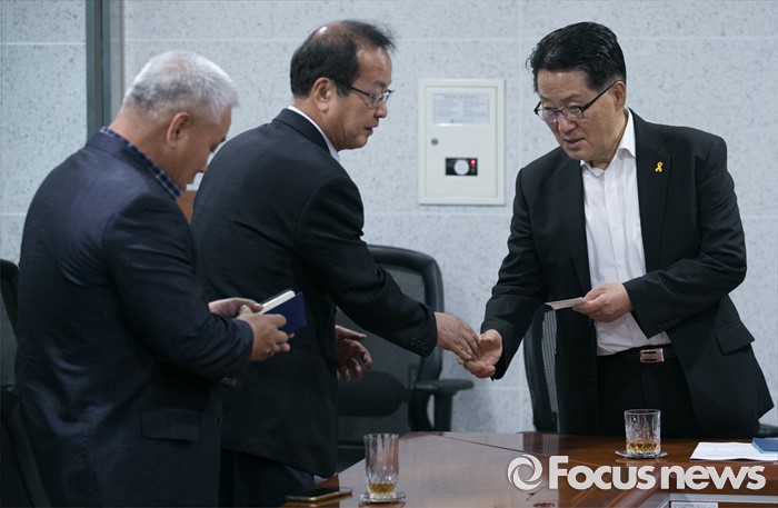 (서울=포커스뉴스) 박지원(오른쪽) 국민의당 원내대표가 26일 오후 서울 여의도 국회 의원회관 의원실에서 개성공단 입주기업 협력업체 대표단과 만나 면담을 하고 있다.