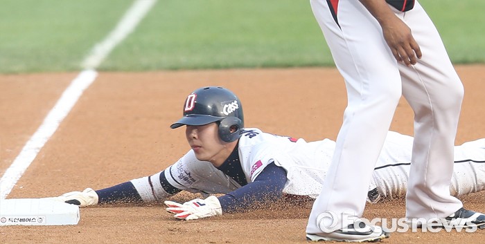 | △ 3루에서 세이프되는 두산 박건우 |