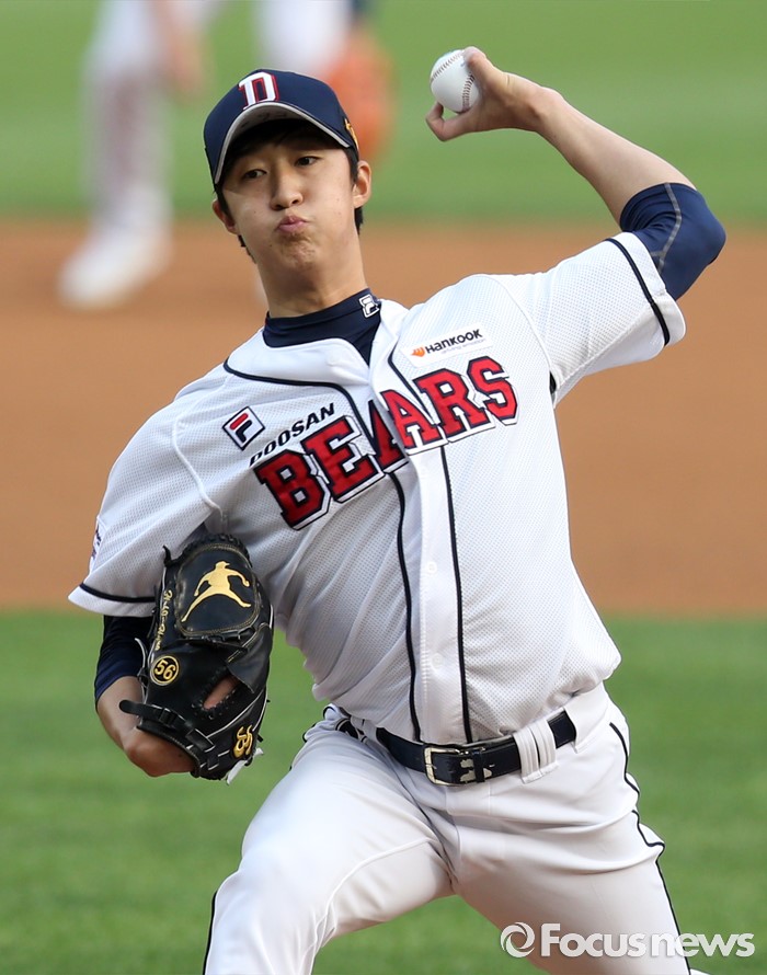 (서울=포커스뉴스) 26일 서울 잠실구장에서 열린 2016프로야구 kt-두산 경기에서 1회초 두산 선발투수 허준혁이 투구하고 있다.