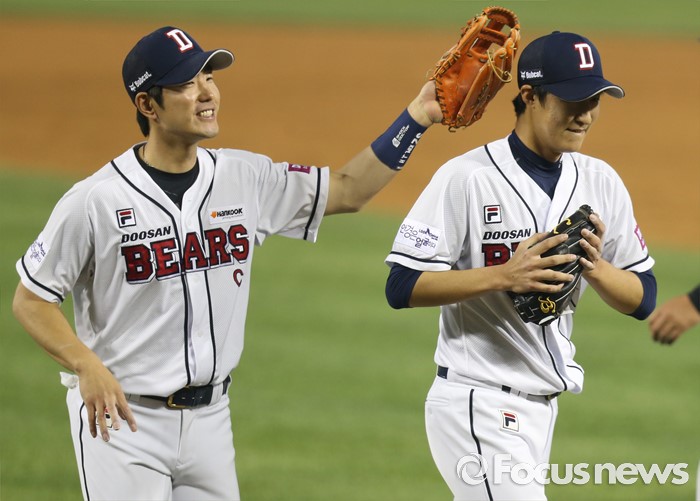 (서울=포커스뉴스) 26일 서울 잠실구장에서 열린 2016프로야구 kt-두산 경기에서 두산 유격수 김재호가 4회초 수비를 마치고 덕아웃으로 들어가며 투수 허준혁을 격려하고 있다.
