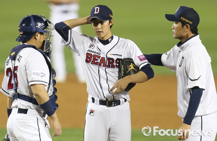 (서울=포커스뉴스) 26일 서울 잠실구장에서 열린 2016프로야구 kt-두산 경기 5회초 두산 한용덕 투수 코치가 마운드에 올라가 주자를 내보낸 허준혁에게 작전을 전달하고 있다.