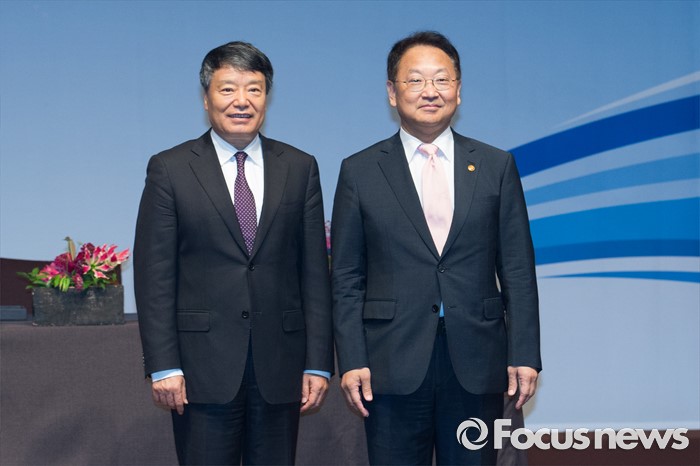 (서울=포커스뉴스) 유일호(오른쪽) 경제부총리 겸 기획재정부 장관과 쉬 사오스 중국 국가발전개혁위원회 주임이 27일 오전 서울 중구 신라호텔 영빈관에서 열린 제14차 한중경제장관회의에 참석해 기념촬영 하고 있다.