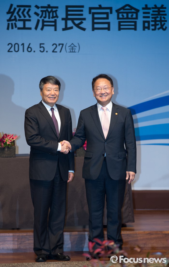 (서울=포커스뉴스) 유일호(오른쪽) 경제부총리 겸 기획재정부 장관과 쉬 사오스 중국 국가발전개혁위원회 주임이 27일 오전 서울 중구 신라호텔 영빈관에서 열린 제14차 한중경제장관회의에 참석해 악수하고 있다.