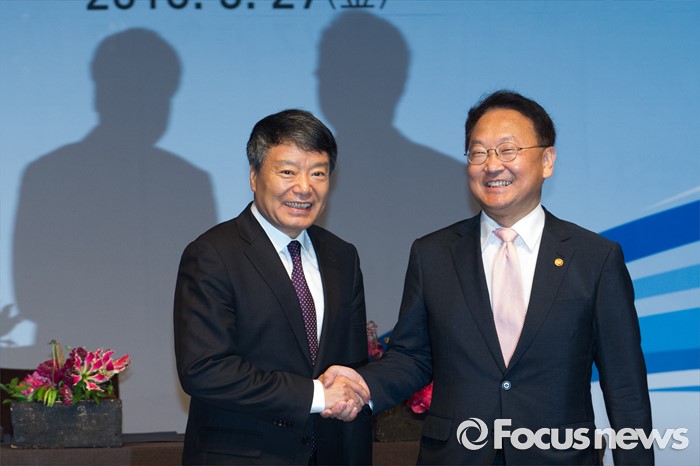 (서울=포커스뉴스) 유일호(오른쪽) 경제부총리 겸 기획재정부 장관과 쉬 사오스 중국 국가발전개혁위원회 주임이 27일 오전 서울 중구 신라호텔 영빈관에서 열린 제14차 한중경제장관회의에 참석해 악수하고 있다.