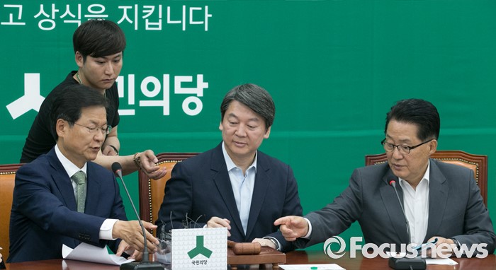 (서울=포커스뉴스) 안철수(가운데) 국민의당 상임공동대표, 천정배(왼쪽) 공동대표, 박지원 원내대표가 27일 오전 서울 여의도 국회에서 열린 최고위원회의에 참석해 마이크를 옮기기 위해 대화하고 있다.