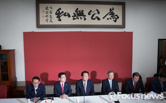 (서울=포커스뉴스) 정진석 새누리당 원내대표와 김희옥 혁신비대위원장 내정자가 27일 오전 서울 여의도 국회에서 원내지도부와 상견례를 하고 있다. 왼쪽부터 김도읍 원내수석부대표, 김광림 정책위의장, 정 원내대표, 김 내정자, 홍문표 사무총장 대행, 민경욱 원내대변인.