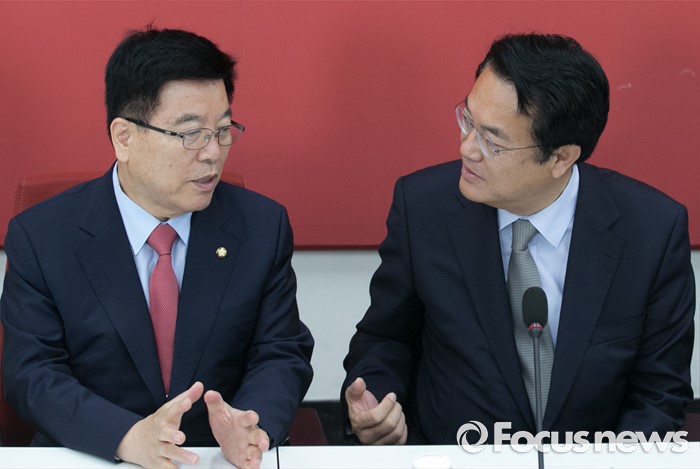 (서울=포커스뉴스) 정진석(오른쪽) 새누리당 원내대표와 김광림 정책위의장이 27일 오전 서울 여의도 국회에서 김희옥 혁신비대위원장 내정자와 원내지도부의 상견례 자리에 참석해 대화하고 있다.