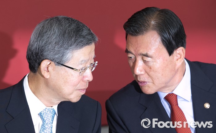 (서울=포커스뉴스) 김희옥(왼쪽) 새누리당 혁신비대위원장 내정자와 홍문표 사무총장 대행이 27일 오전 서울 여의도 국회에서 김 내정자와 원내지도부의 상견례 자리에 참석해 대화하고 있다.