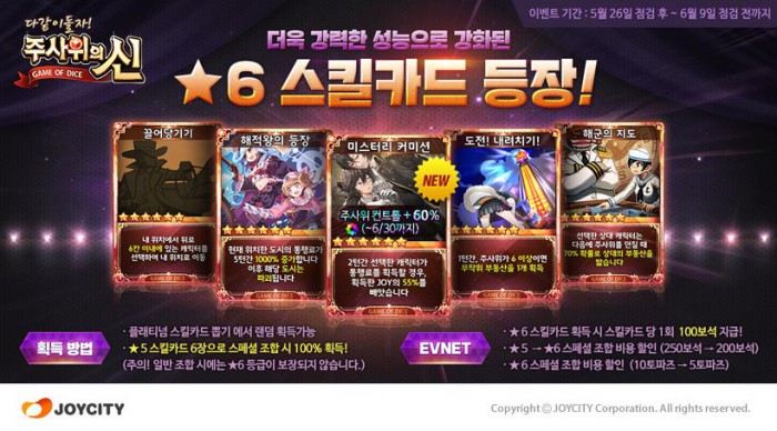 (서울=포커스뉴스) 조이시티(대표 조성원)는 모바일 보드게임 '주사위의 신' 업데이트를 실시했다고 27일 밝혔다. 이번 업데이트를 통해 스킬카드의 최상위 등급이 기존 5성에서 6성으로 확장됐다. 첫 공개된 6성 스킬카드는 5성 스킬카드 6장을 조합하거나 플래티넘 스킬카드 뽑기를 통해 획득할 수 있다.