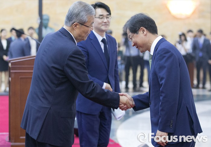 (서울=포커스뉴스) 27일 오전 서울 여의도 국회에서 열린 68주년 국회 개원 기념식에 참석한 김종인(왼쪽) 더불어민주당 비대위 대표와 천정배 국민의당 공동대표가 인사하고 있다.