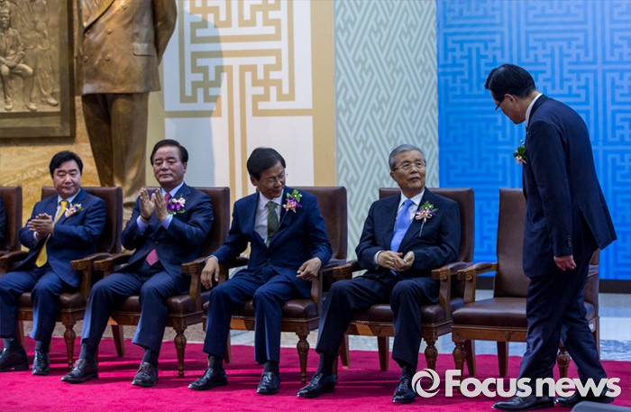 (서울=포커스뉴스) 정의화(오른쪽) 국회의장이 27일 오전 서울 여의도 국회에서 열린 '제68주년 국회 개원 기념식'에 참석해 인사말을 마친 뒤 자리로 돌아가고 있다. 이날 정 의장은 헌법-국회관계법 책을 손에 들고 국회법 개정안에 대해 대통령의 거부권 행사에 대한 입장을 밝혔다.