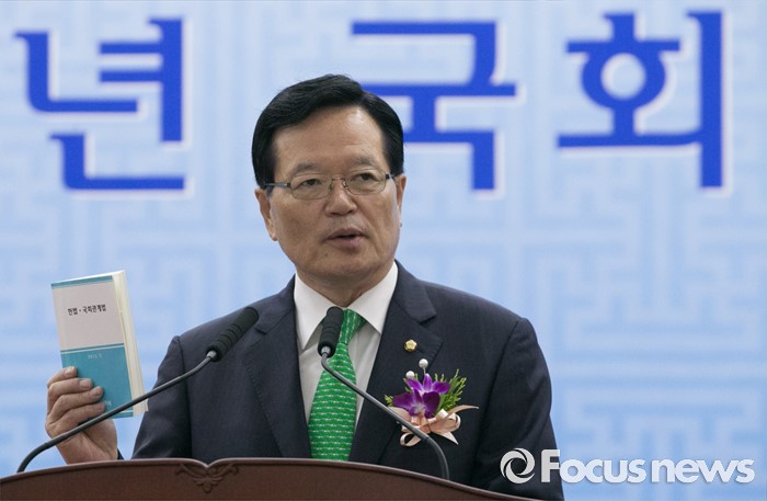 (서울=포커스뉴스) 27일 오전 서울 여의도 국회에서 열린 68주년 국회 개원 기념식에 참석한 정의화 국회의장이 기념사를 통해 정부가 상시 청문회법 등이 포함된 국회법 개정안 재의 요구안을 의결한 것과 관련 헌법 및 국회관계법 책을 들고 입장을 전하고 있다.