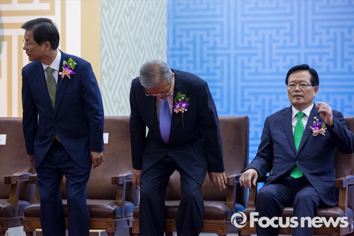 (서울=포커스뉴스) 정의화(오른쪽) 국회의장과 김종인(오른쪽 두 번째) 더불어민주당 비상대책위 대표, 천정배 국민의당 공동대표가 27일 오전 서울 여의도 국회에서 열린 '제68주년 국회 개원 기념식'에 참석해 국민의례를 마친 뒤 자리에 앉고 있다.