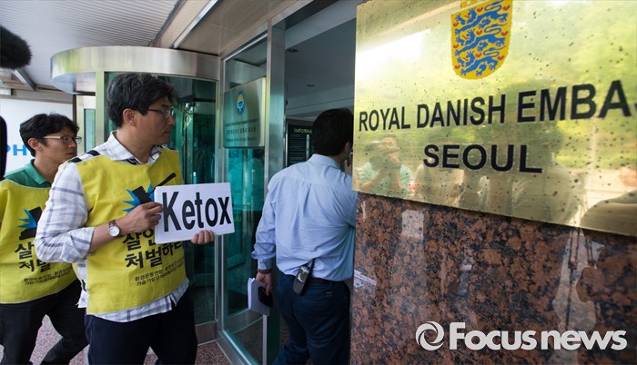 (서울=포커스뉴스) 환경보건시민센터 관계자들이 27일 오전 서울 용산구 주한 덴마크대사관에서 가습기살균제 사건 관련 덴마크 정부 행동 촉구 항의서한을 전달하기 위해 들어가고 있다.