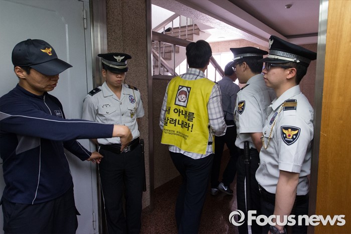 (서울=포커스뉴스) 환경보건시민센터 관계자들이 27일 오전 서울 용산구 주한 덴마크대사관에서 가습기살균제 사건 관련 덴마크 정부 행동 촉구 항의서한을 전달하기 위해 들어가고 있다.