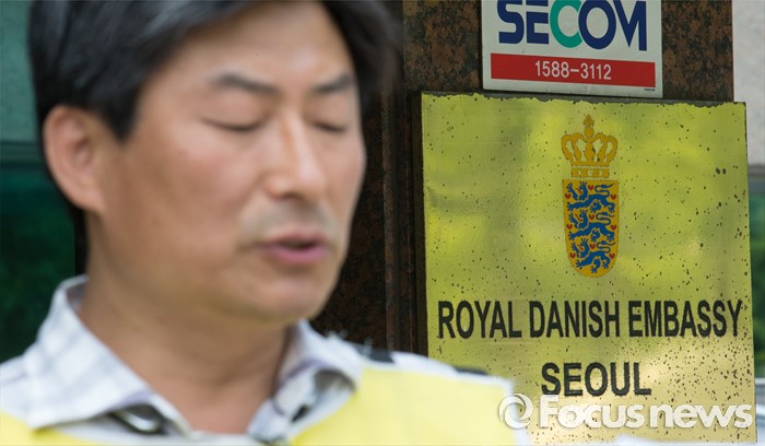 (서울=포커스뉴스) 환경보건시민센터 관계자들이 27일 오전 서울 용산구 주한 덴마크대사관 앞에서 가습기살균제 사건 관련 덴마크 정부 행동 촉구 항의서한 전달 기자회견을 하고 있다.