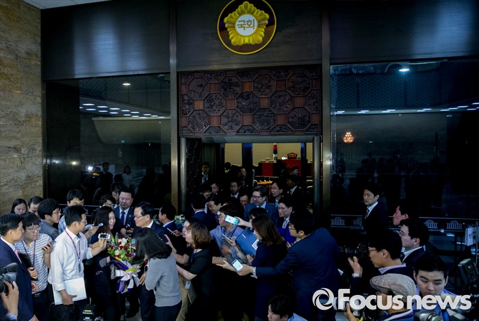 (서울=포커스뉴스) 27일 오전 서울 여의도 국회에서 68주년 국회 개원 기념식을 마친 정의화 국회의장이 본회의장에서 직원들과 기념촬영 후 취재진 질문을 받으며 이동하고 있다.