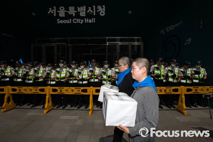(서울=포커스뉴스)27일 오전 서울 중구 서울시청 앞에서 전국 장애인 부모연대와 서울특수학교학부모협의회 회원들의 발달장애인 정책 수립을 촉구하는 삭발식이 끝난 뒤 참가자들이 박원순 시장에게 전달하기 위해머리카락이 담긴 박스를 들고 시청 입구로 향하고 있다.