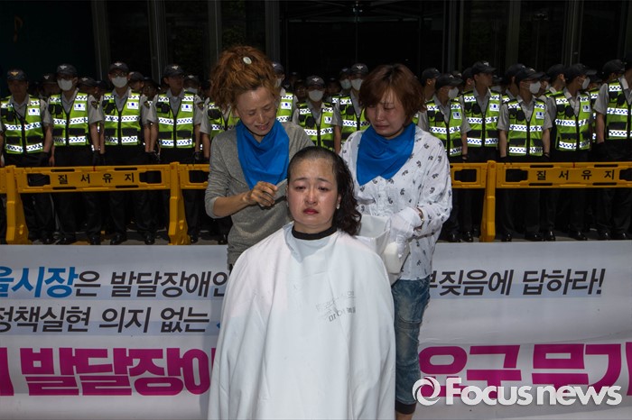 (서울=포커스뉴스)27일 오전 서울 중구 서울시청 앞에서 전국 장애인 부모연대와 서울특수학교학부모협의회 회원들이 발달장애인 정책 수립을 촉구하며 삭발식을 하고 있다.