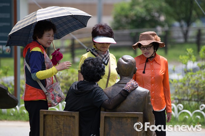 (음성=포커스뉴스) 관광객들이 27일 오후 충북 음성군 원남면 반기문 UN사무총장 생가 앞에 설치된 동상과 기념촬영하고 있다.