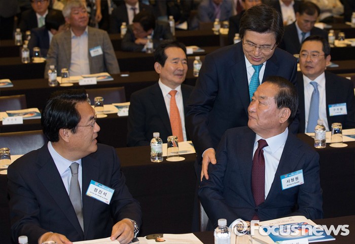 (서울=포커스뉴스) 27일 오후 서울 웨스틴 조선호텔에서 열린 2016 한반도통일 심포지엄에 참석한 황교안(뒤) 국무총리와 서청원(앞줄 오른쪽) 새누리당 전 최고위원이 인사하고 있다. 앞줄 왼쪽은 정진석 원내대표.