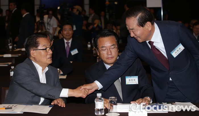 (서울=포커스뉴스) 27일 오후 서울 웨스틴 조선호텔에서 열린 2016 한반도통일 심포지엄에 참석한 서청원(오른쪽부터) 새누리당 전 최고위원, 정진석 원내대표, 박지원 국민의당 원내대표가 인사하고 있다.