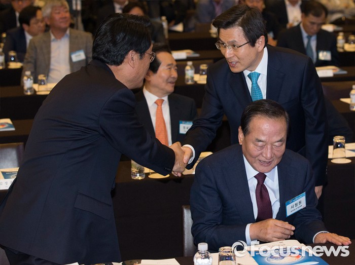 (서울=포커스뉴스) 27일 오후 서울 웨스틴 조선호텔에서 열린 2016 한반도통일 심포지엄에 참석한 황교안(뒷줄 오른쪽) 국무총리와 정진석 새누리당 원내대표가 인사하고 있다. 앞줄 오른쪽은 서청원 전 최고위원.