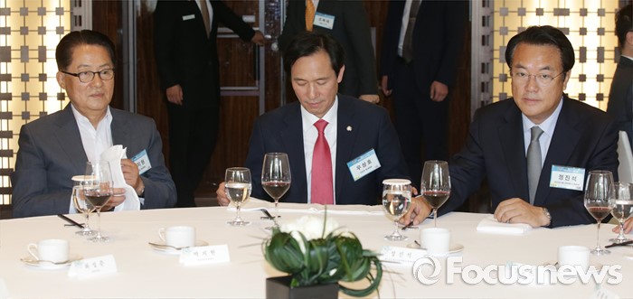 (서울=포커스뉴스) 27일 오후 서울 웨스틴 조선호텔에서 열린 2016 한반도통일 심포지엄 기념 오찬에 참석한 정진석(오른쪽부터) 새누리당 원내대표, 우상호 더불어민주당 원내대표, 박지원 국민의당 원내대표가 자리하고 있다.