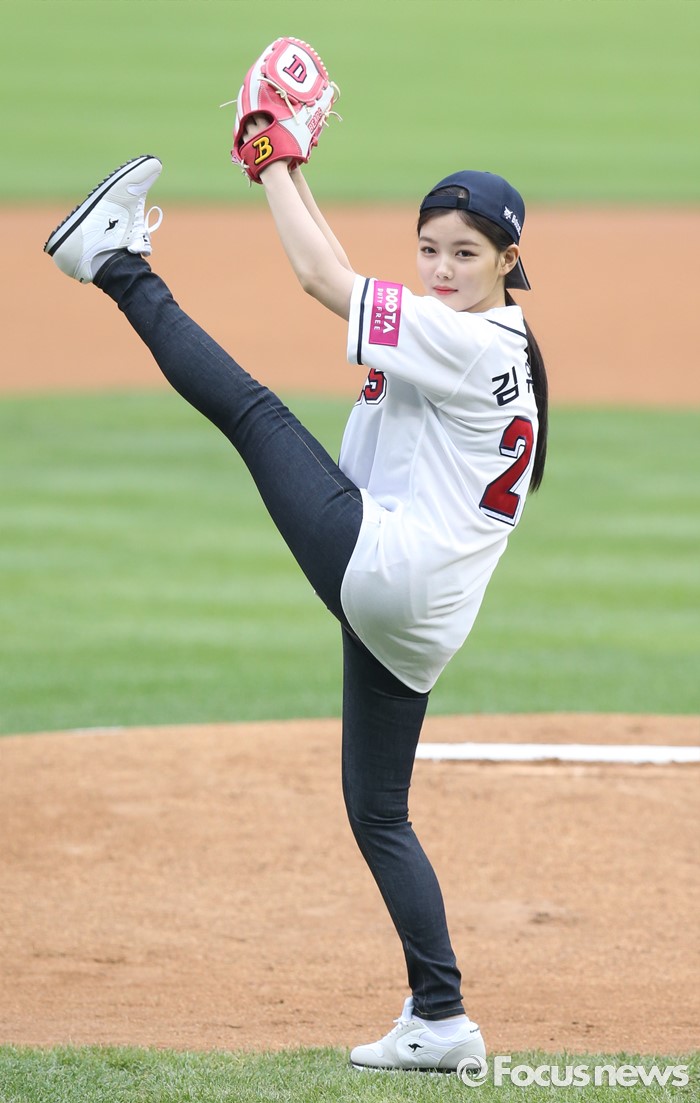 (서울=포커스뉴스) 27일 서울 잠실구장에서 열린 2016 프로야구 LG-두산 경기에 앞서 배우 김유정이 와인드업하며 발을 높이 들어 올리고 있다.