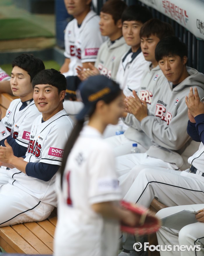 (서울=포커스뉴스) 27일 서울 잠실구장에서 열린 2016 프로야구 LG-두산 경기에 앞서 시구를 마치고 퇴장하는 배우 김유정을 향해 덕아웃의 두산 선수들이 박수를 치고 있다.