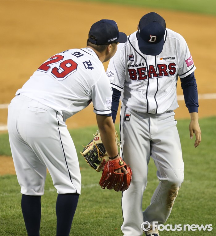 (서울=포커스뉴스) 27일 서울 잠실구장에서 열린 2016프로야구 LG-두산 경기에서 두산 투수 유희관이 4회초 수비를 마치고 들어오는 중견수 민병헌을 맞이하고 있다.