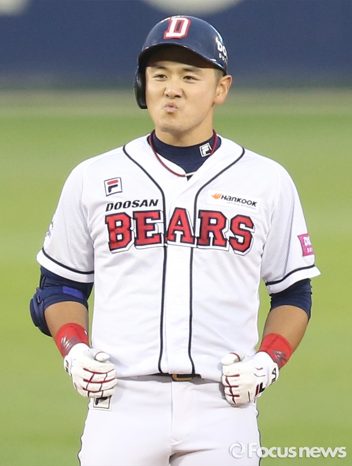 (서울=포커스뉴스) 27일 서울 잠실구장에서 열린 2016프로야구 LG-두산 경기 2회말 2사 2루에서 두산 최주환이 좌전 안타를 치고 2루주자가 홈인하는 사이 2루까지 뛰어 세이프된후 흡족한 표정을 짓고 있다.