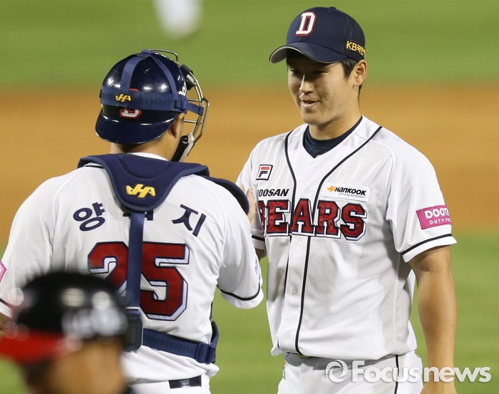 (서울=포커스뉴스) 27일 서울 잠실구장에서 열린 2016프로야구 LG-두산 경기에서 LG에 승리한 두산 투수 진야곱과 포수 양의지가 주먹을 마주치고 있다.