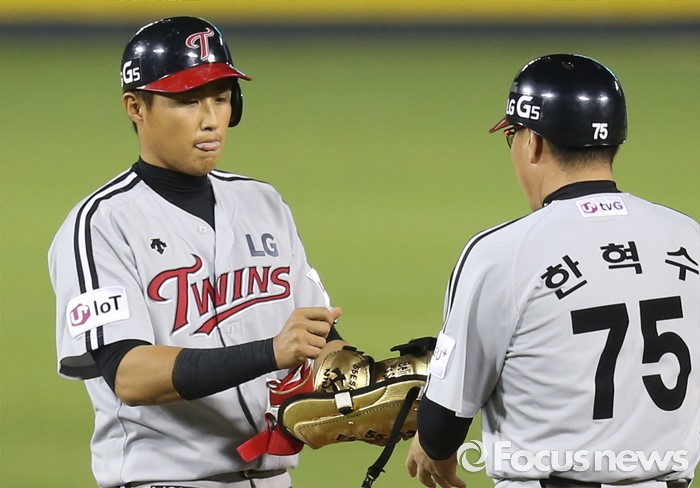 (서울=포커스뉴스) 27일 서울 잠실구장에서 열린 2016프로야구 LG-두산 경기 8회초 1사 2루에서 LG 채은성이 주자를 불러 들이는 좌익수 왼쪽 2루타를 치고한혁수 코치와 주먹을 마주치고 있다.