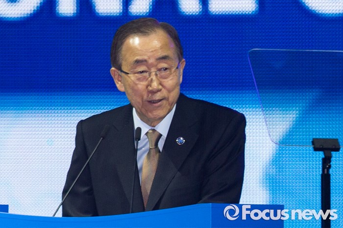 (서울=포커스뉴스) 반기문 유엔 사무총장이 29일 오전 경기 고양시 킨텍스 제1전시장에서 열린 2016 국제로타리 세계대회에 참석해 기조연설 하고 있다.