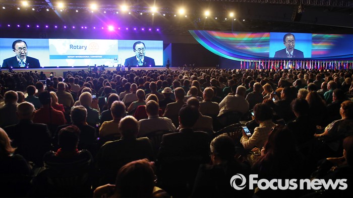 (서울=포커스뉴스) 반기문 유엔 사무총장이 29일 오전 경기 고양시 킨텍스 제1전시장에서 열린 2016 국제로타리 세계대회에 참석해 기조연설 하고 있다.