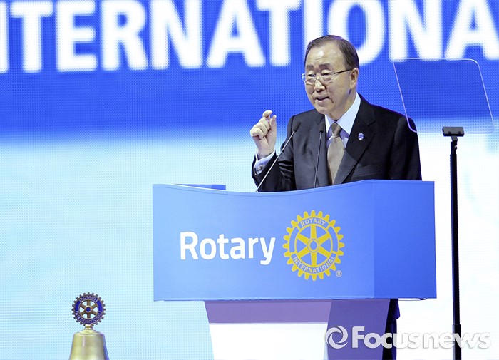(서울=포커스뉴스) 반기문 유엔 사무총장이 29일 오전 경기 고양시 킨텍스 제1전시장에서 열린 2016 국제로타리 세계대회에 참석해 기조연설 하고 있다.